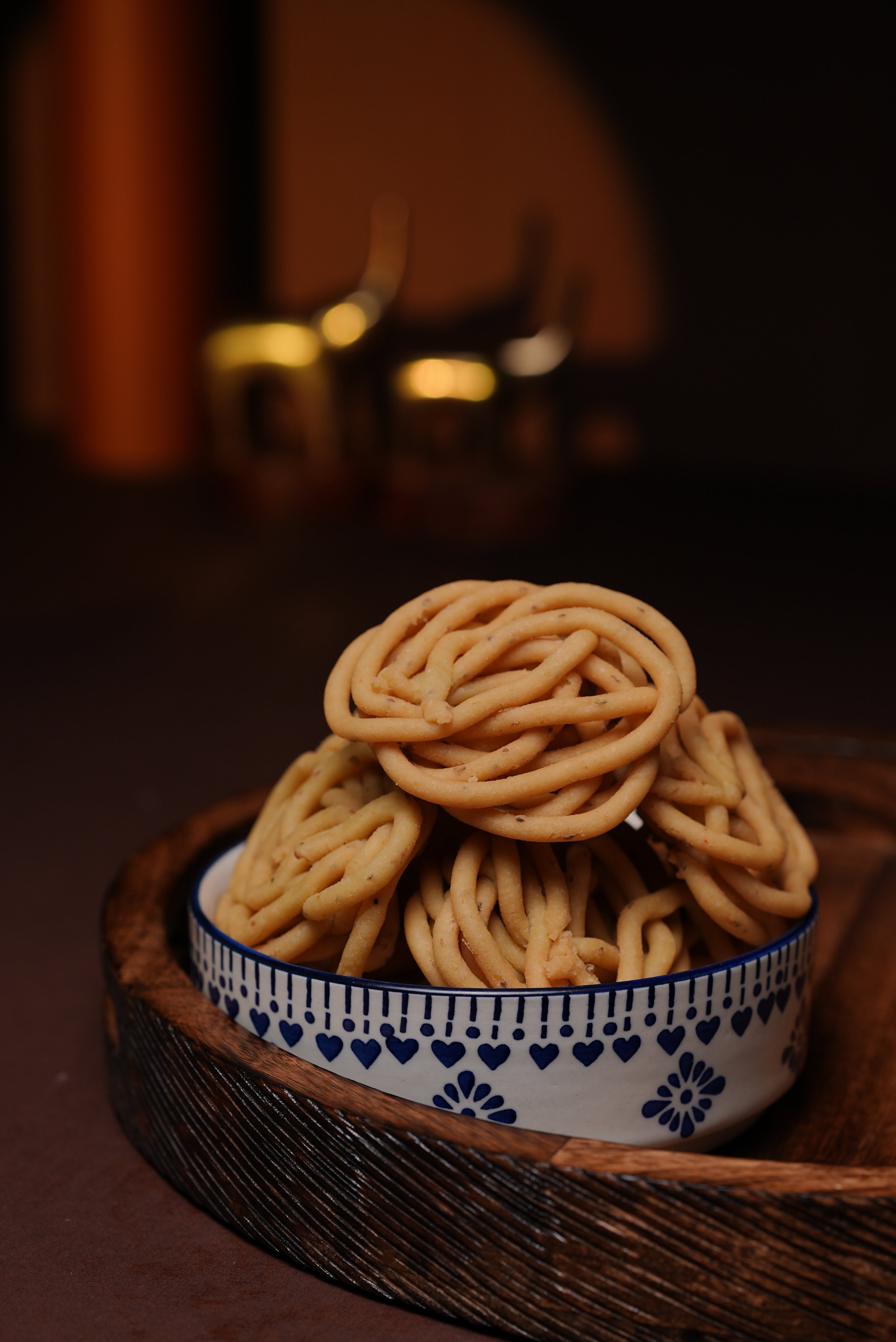 Janthikalu are a classic Andhra-style savory snack, renowned for their crunchy texture and spiral shape, making them an irresistible tea-time or festive treat. Crafted with a blend of rice flour, butter, red chili powder, ajwain, and sesame seeds, each Janthikalu is deep-fried to golden perfection, delivering a burst of spicy flavor with every bite.